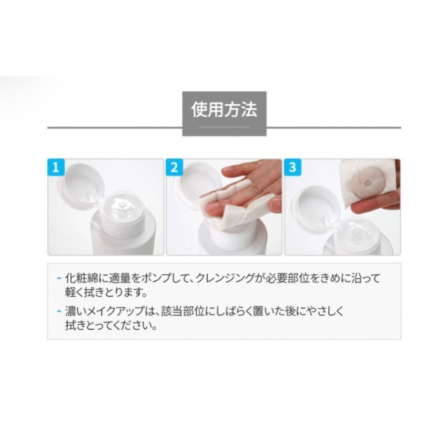 ■使用方法:化粧綿に適量をポンプして、クレンジングが必要部位をきめに沿って軽く拭きます。濃いメイクアップは、該当部位にしばらく置いた後に拭いてください。(アイ、リップ、フェイス及びボディにも使用可能)